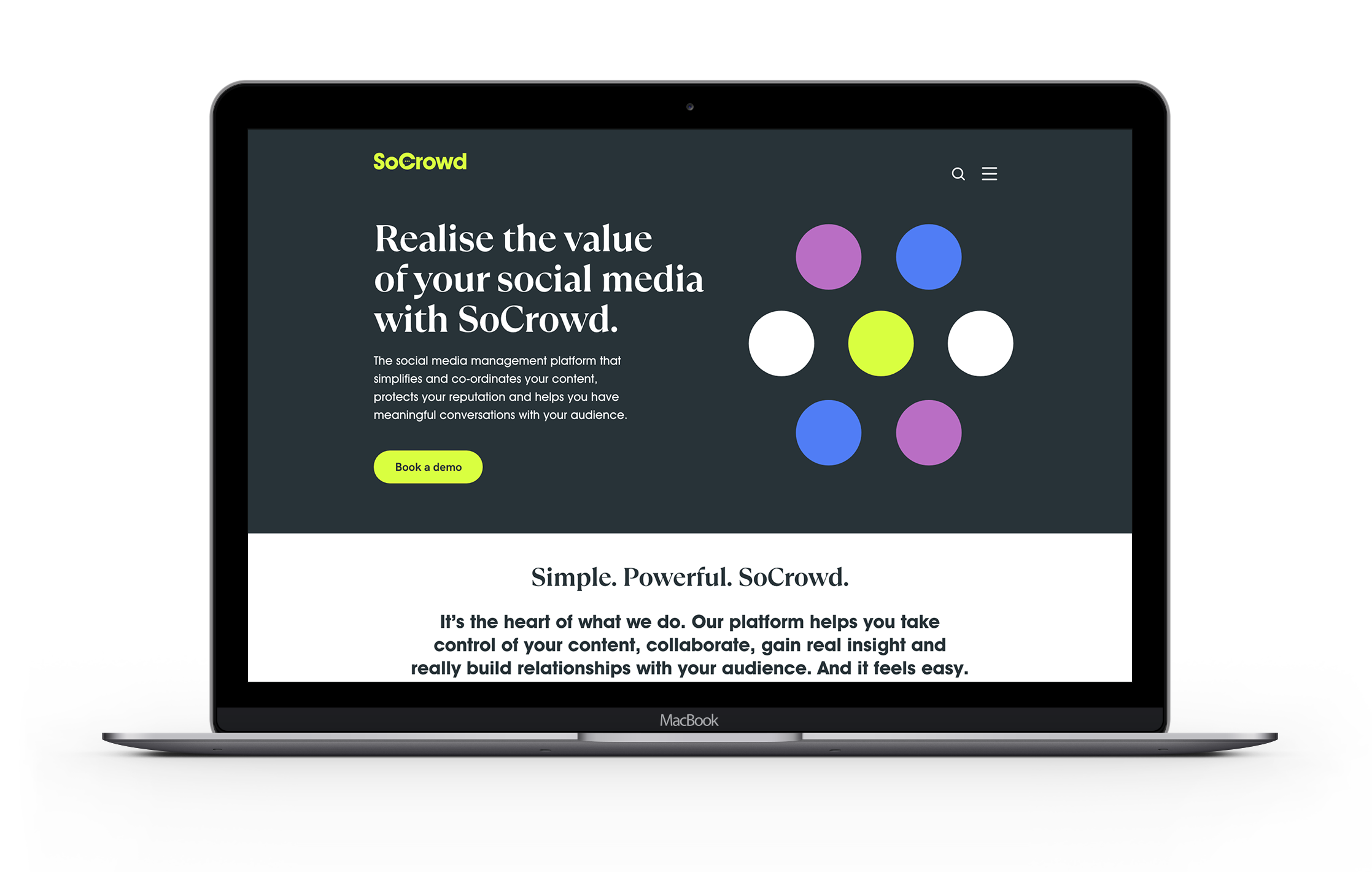 The digital presence of the brand needed to reflect the simplicity and power of the new SoCrowd platform UX and UI. ultimately being the go-to sales tool for encouraging demo booking.